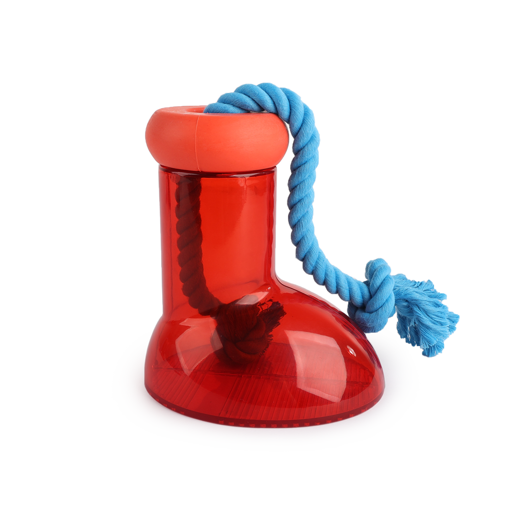 Deze voer of snack dispenser houdt honden urenlang bezig! Draai de bovenkant van de laars af, doe een paar brokjes of snacks in de laars en draai de bovenkant er weer op. De hond moet goed zijn of haar best doen om de lekkernijen langs het touw uit de opening aan de bovenzijde te krijgen. Dankzij het touw kan de hond de laars makkelijk vastpakken en verplaatsen. Ideaal als de hond zich verveelt, alleen thuis moet zijn of als beloning.