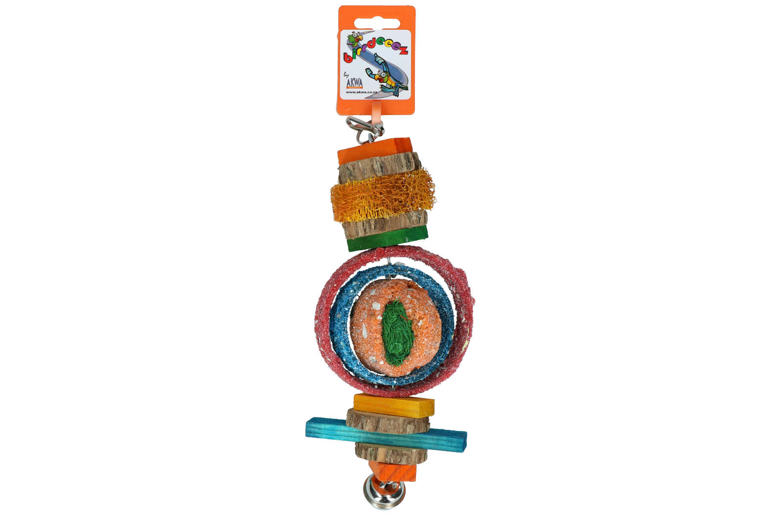 Draagt bij aan het onderhoud van de pootjes en snavel van uw vogel. Makkelijk te monteren met behulp van het karabijnhaakje. Bevat luffa, rondjes met zandstructuur, gekleurd hout en een leuke bel aan de onderzijde voor extra speelplezier.