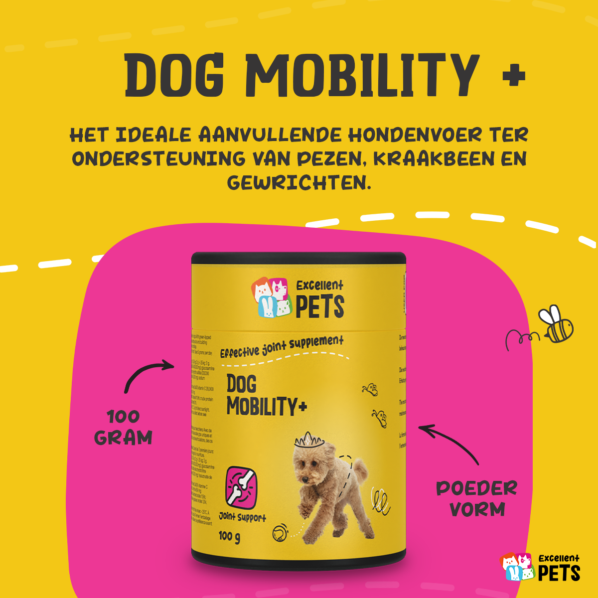Excellent Pets Dog Mobility+ is een aanvullend diervoeder voor honden in poedervorm. Het is de meest complete formule voor de smering en ondersteuning en het behoud van pezen, kraakbeen, banden en gewrichten.