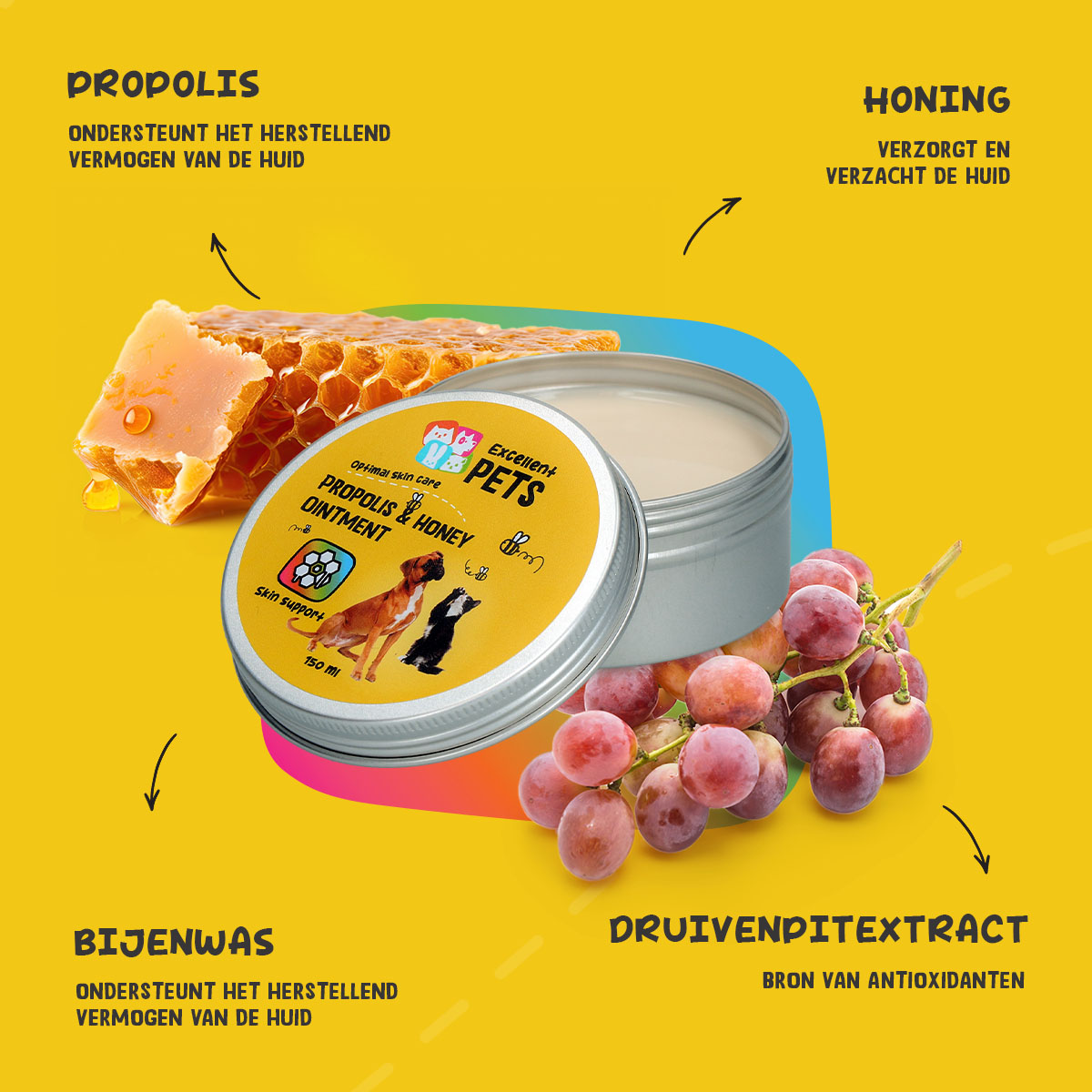 Excellent Pets Propolis & Honey Ointment bevat onder andere propolis en honing. Propolis, ook wel bijenlijm genoemd, is een natuurlijk product dat door bijen gemaakt wordt om het bijennest te verstevigen en voor goede hygiënische omstandigheden in het bijennest. Propolis heeft verzorgende eigenschappen en het ondersteunt het herstellend vermogen van de huid. Honing werkt eveneens verzorgend en het draagt bij aan het herstel van de huid.