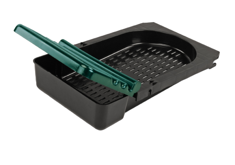 Inclusief een voor pluimvee onbereikbare opvangbak met deksel ter bescherming van de eieren.