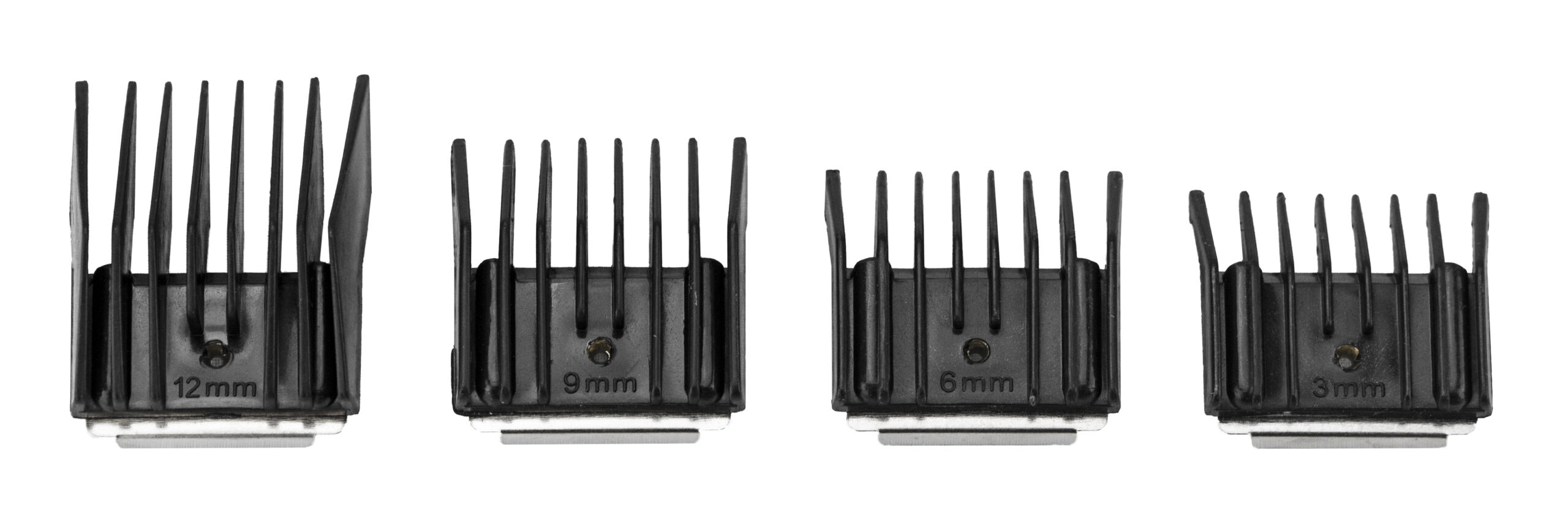 Set van 4 kammen: 12 mm, 9 mm, 6 mm en 3 mm. Deze opzetkammen zijn zowel geschikt voor de CLIP006 als de MOSE0011.