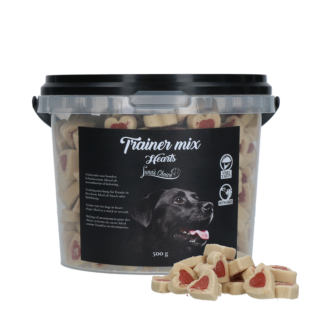 All you need is love ! En van deze surf en turf-snack houdt iedere hond! Deze trainer-snack is gevuld met vlees en zalm en is een semi-moist soft beloning. Dit houdt in dat deze snacks nog licht vochtig zijn en daardoor extreem krachtig zijn in smaak en geur. Daarom zijn dit ook de ideale snacks voor hondentrainers en baasjes om hun honden en pups te belonen bij goed gedrag tijdens een training of cursus. Deze trainer-snack bevat geen toegevoegde suikers en het mooiste van alles is dat deze snoepjes gemaakt zijn in Nederland!