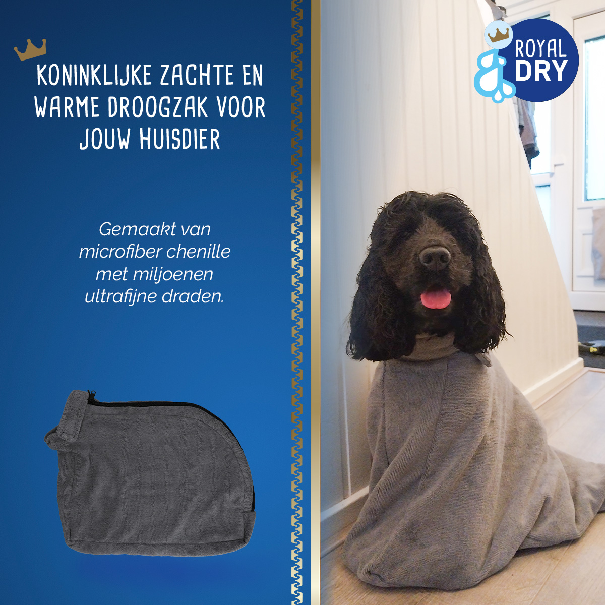 De producten van Royal Dry zijn ontwikkeld om je hond als een koning of koningin te behandelen, nadat ze nat of modderig zijn geworden. Het doel is een blije hond en een schoon huis! De Royal Dry producten zijn gemaakt van microvezel chenille, een heerlijk zacht en pluizig garen. Door de vele lusjes, die gemaakt zijn van miljoenen ultrafijne draden, is het oppervlak vele malen groter dan dat van een gladde stof. Hierdoor kunnen de Royal Dry producten maar liefst 7x hun eigen gewicht in vocht opnemen en vasthouden! Perfect om te gebruiken na een bos- of strandwandeling, na het wassen of gewoon op een regenachtige dag. Of je nu je hond droog wil maken, warm wil houden of je huis of auto schoon wil houden, bij Royal Dry vind je het juiste product!