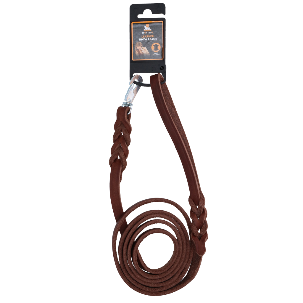 Spotted! Pro Hoogwaardige kwaliteit lederen showlijn! Gun jezelf en jouw hond het beste met deze topkwaliteit lederen showlijn! Niet alleen praktisch maar ook een blikvanger! Voorzien van prachtig vlechtwerk bij het handvat en het bevestingingspunt van de halsband. In combinatie met het prachtige leer zorgt dit voor een zeer chique uitstaling! Gemaakt uit het  bovenleer van het rund. Dit is volledig doorgelooid is dus zacht en soepel. Dankzij dit looiproces is de huidstructuur nog zichtbaar voor een prachtige natuurlijke uitstraling. Dit leer is afgewerkt met natuurlijke olie, hetgeen de soepelheid van het leer nog verder vergroot! De metaaldelen van de lijn zijn in stijlvol en rustiek oud-zilver afgewerkt. Hierdoor mag je de volgende eigenschappen van dit product verwachten: